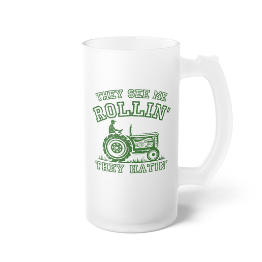 Frosted Glass Beer Mug - They See Me Rollin They Hatin Tractor