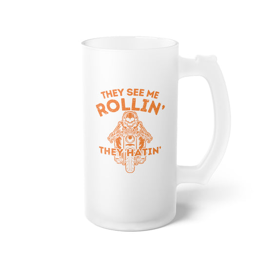 Frosted Glass Beer Mug - They See Me Rollin They Hatin Motorcycle