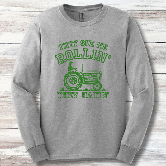 They See Me Rollin They Hatin Tractor Long Sleeve Tee | Farmer Gift