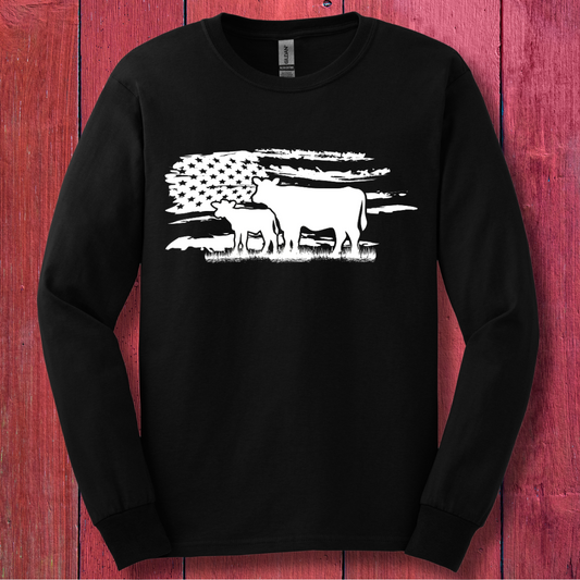 USA Cow Distressed Flag Long Sleeve Tee | Farmer Gift
