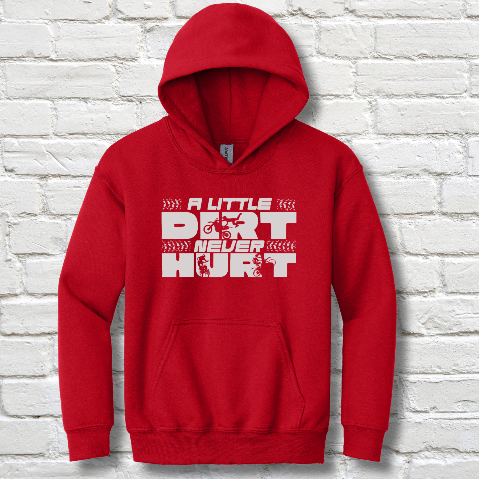 Get ready for muddy fun with the 🏍️ “A Little Dirt Never Hurt” youth hoodie from Oak Grove Expressions! Perfect for every motocross kid who loves adventure and the thrill of the dirt track, this cozy race day sweatshirt captures the spirit of outdoor fun. Featuring bold silhouettes of dirt bikers performing stunts in the design’s lettering, it’s a favorite among kids who live for speed and excitement. Whether it’s for race day, a birthday gift, or a biker Christmas gift, this durable hoodie is ideal for kids clothing collections and makes a great addition for any young dirt bike fan!