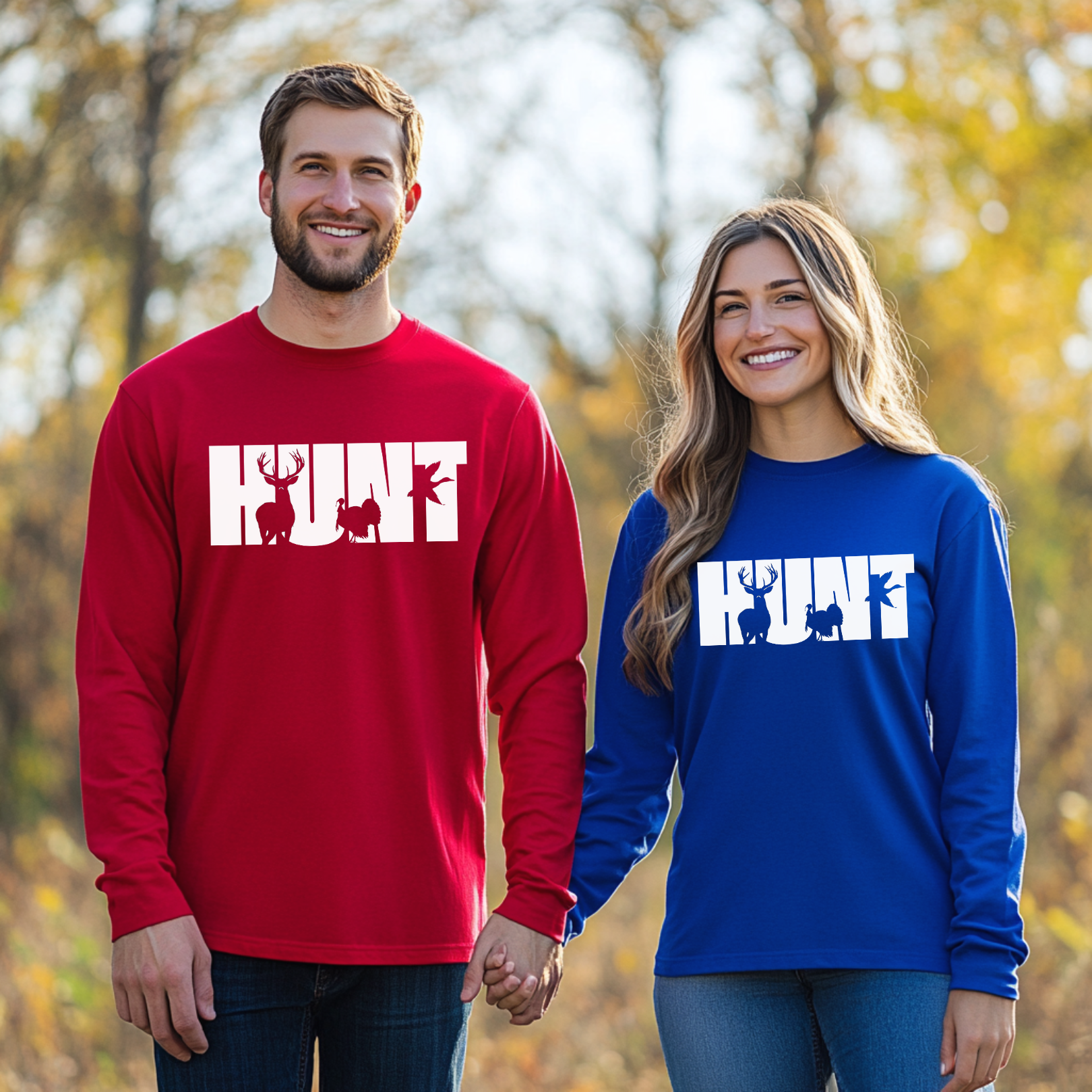 The unique design of the HUNT long sleeve tee sets it apart from ordinary hunting shirts. The negative space silhouettes of the deer, turkey, and mallard celebrate your love of the hunt, while the bold lettering creates a modern, eye-catching aesthetic. This makes it not only functional as hunting gear but also a statement piece for casual outings, hunting trips, or outdoor gatherings. For those who enjoy funny hunting hoodies or want to coordinate with other hunting themed clothing, this long sleeve tee complements your collection seamlessly.