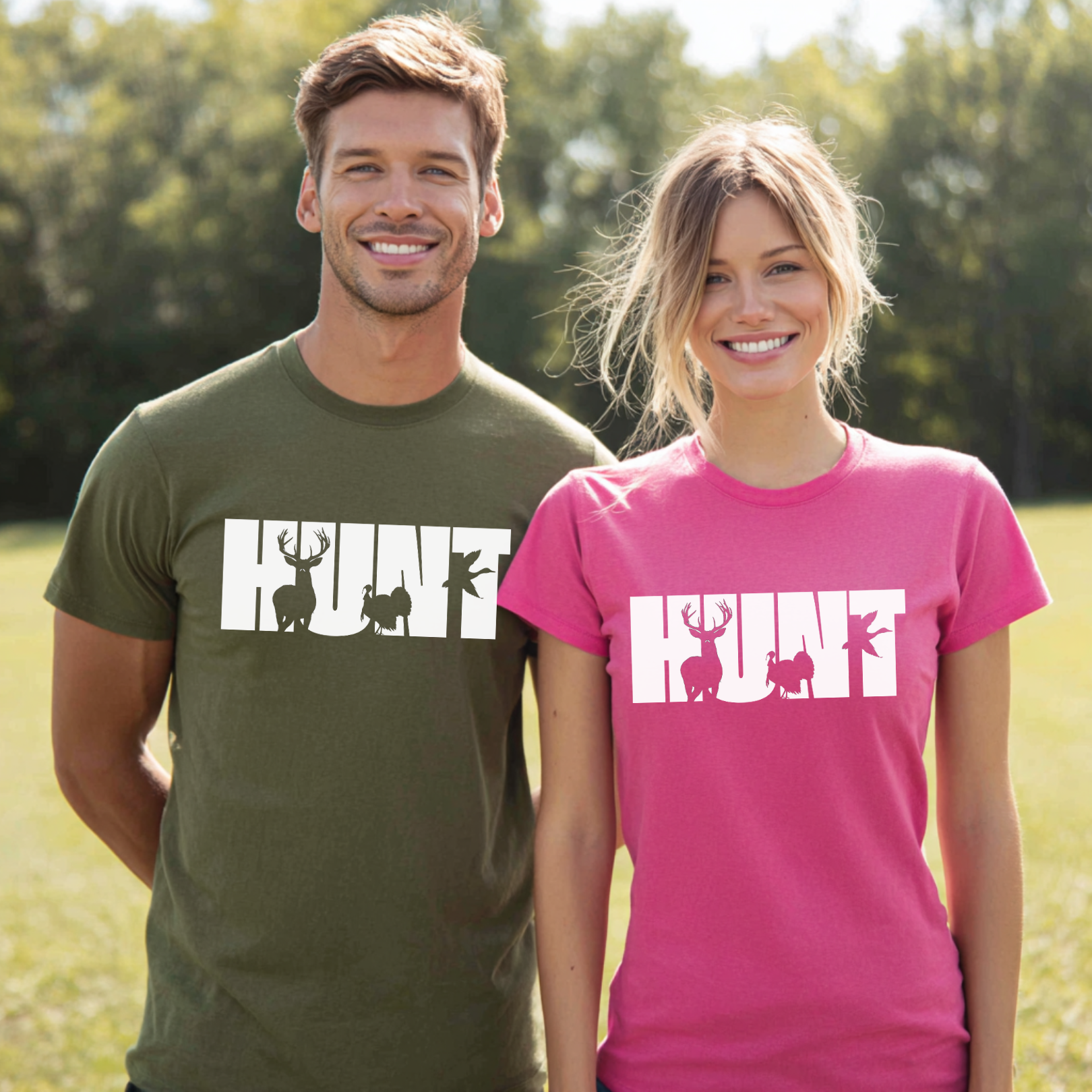 Celebrate the thrill of the outdoors with the HUNT T-Shirt from Oak Grove Expressions — a bold and meaningful design created for men and women who live for the excitement of the hunt. Whether you’re a deer hunter, duck hunter, or turkey hunter, this exclusive tee connects your passion with a striking and stylish look. Featuring the word HUNT in large, strong lettering, the design incorporates the silhouettes of a majestic male deer buck, a wild turkey, and a soaring mallard in the negative space of the letters, making it a truly standout piece of hunting lifestyle apparel. 🦌🦃🦆