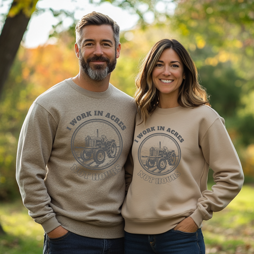 Perfectly suited for anyone who understands that time isn’t measured by the clock, but by the work accomplished in the field, this farmer sweatshirt has become a standout among farmer sweatshirts funny and heartfelt. The phrase "I Work In Acres, Not Hours" is a powerful reminder that the farming lifestyle runs deep, and those who live it know it’s not just a job—it’s a calling. Whether worn on a cool morning at the local feed store or as a conversation starter at a weekend fair, this cozy crewneck lets everyone know where your roots lie.