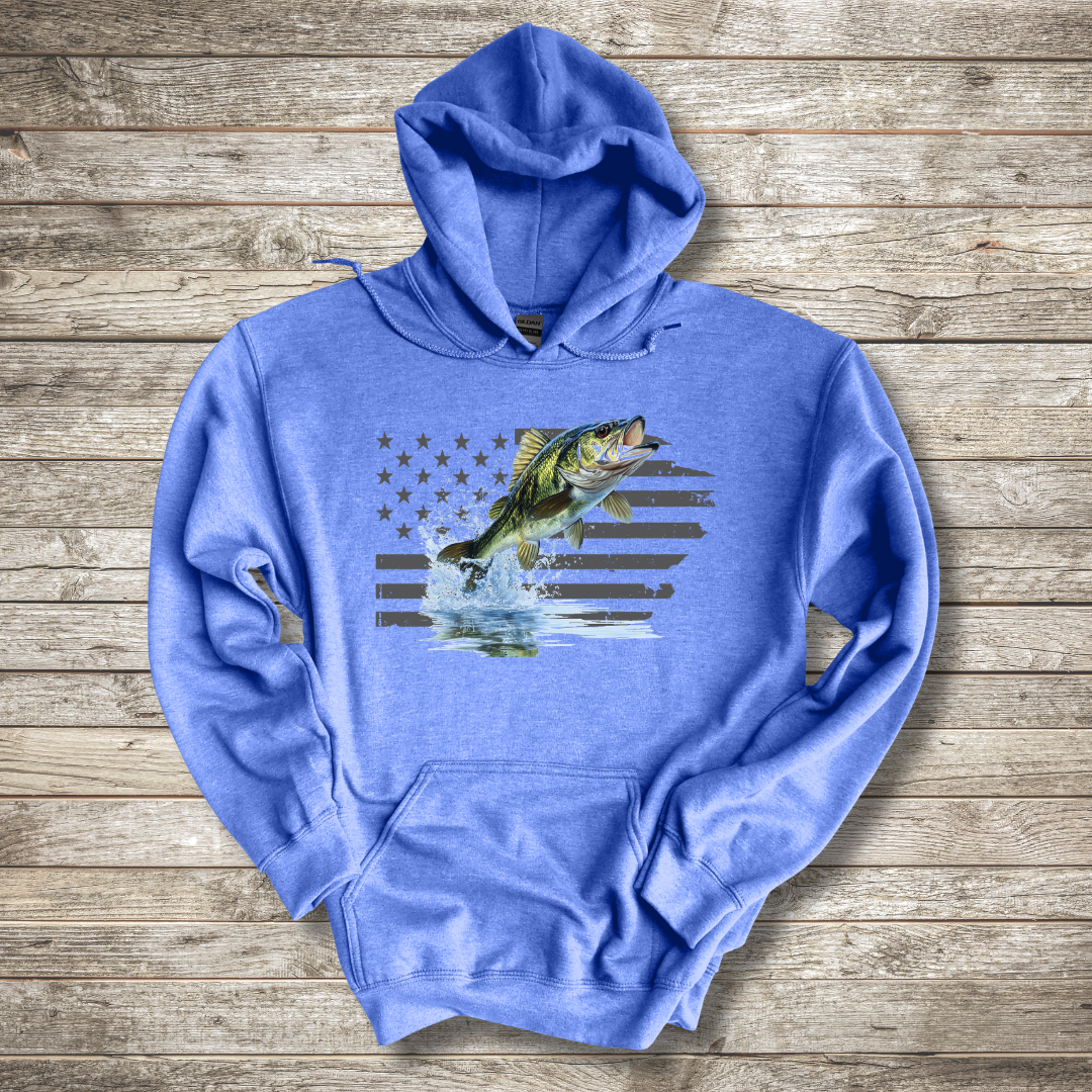 Largemouth Bass with Distressed Flag Hoodie | Fishing Gifts for Men