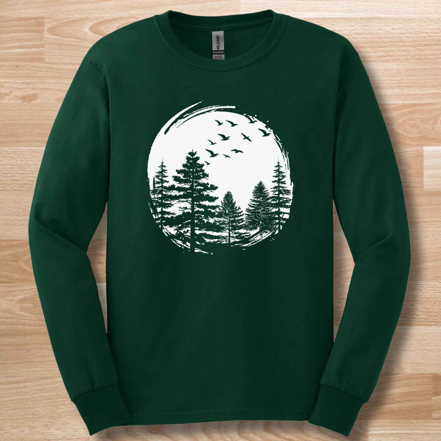 The Nature Lover Pines long sleeve tee from Oak Grove Expressions is designed for women who feel most at peace under the sky, surrounded by tall pines and the quiet rustle of nature 🌲✨. This unique design features a stylized circle spinning counterclockwise, with pine tree silhouettes rising upward as birds drift northeast, symbolizing movement, freedom, and harmony with the outdoors. It’s a truly artistic camp shirt that celebrates the outdoorsy lifestyle while offering comfort and style.