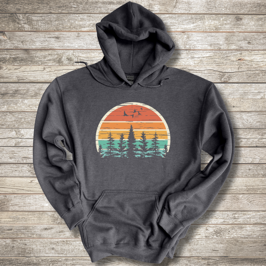 Celebrate the outdoors with Oak Grove Expressions’ “Nature Retro Vibe” long sleeve hoodie 🌞🌲. Featuring a retro sun, spruce trees, and birds in flight, this camp shirt makes the best camping gifts, camper gift, mom gift, mother’s day gifts, retirement gift, and gifts for camper owners who love nature’s vibe.