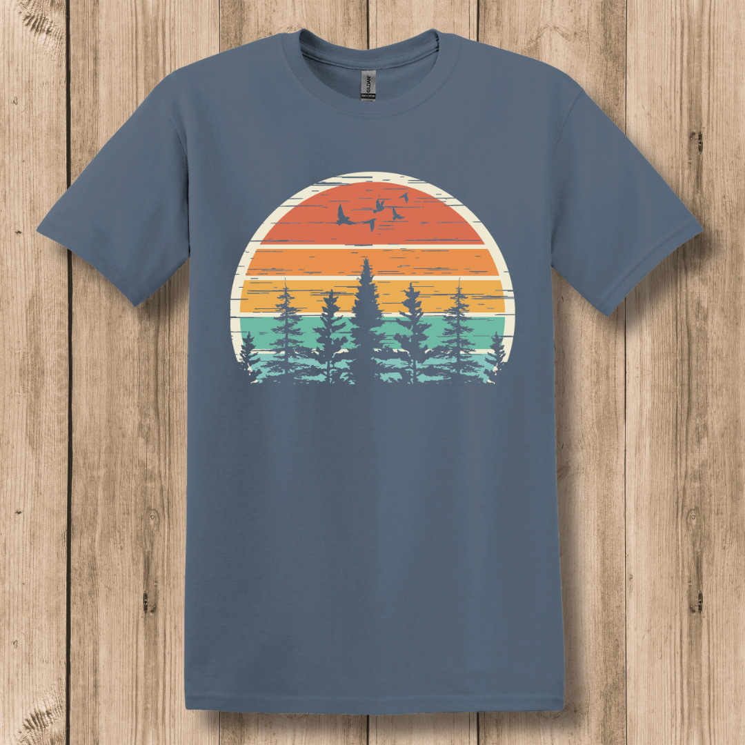 Celebrate your love for the great outdoors with the “Nature Retro Vibe” t-shirt from Oak Grove Expressions. Designed for those who find peace and inspiration under the open sky, this camp shirt features a bold retro sun with the silhouette of towering spruce trees and graceful flying birds. It perfectly captures the American passion for outdoor adventure and timeless natural beauty 🌞🌲🕊️.