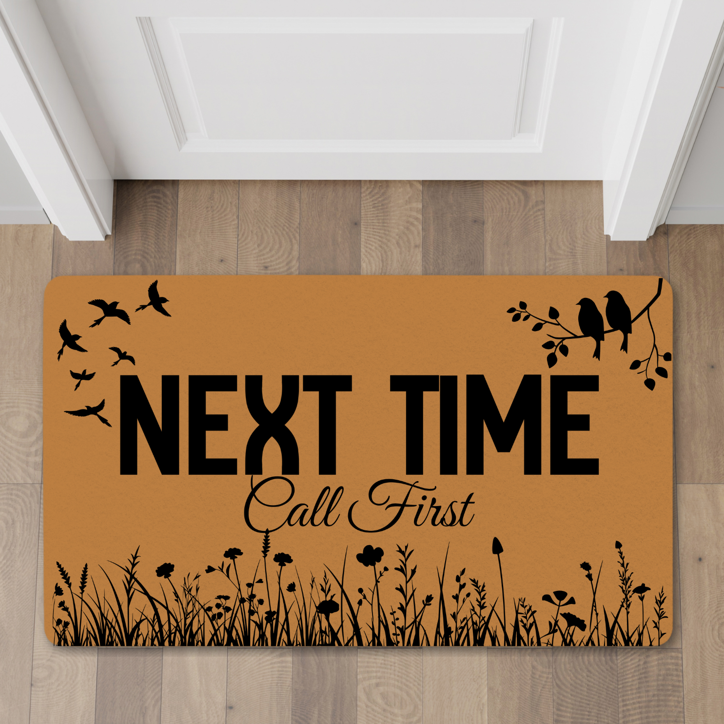 Welcome your guests with a touch of humor and personality with the “Next Time Call First” Funny Doormat from Oak Grove Expressions. This clever and colorful doormat blends charm, practicality, and laughter—making it the perfect way to express your fun-loving spirit right at your doorstep. Measuring 18" x 30", this durable welcome door mat is crafted from 100% polyester with a 100% rubber backing base, designed to stay in place while adding style to your entryway. Whether you live in the city, the country, or your favorite RV park, this mat is the ideal accent piece for Rustic Home Decor and County Style Décor.