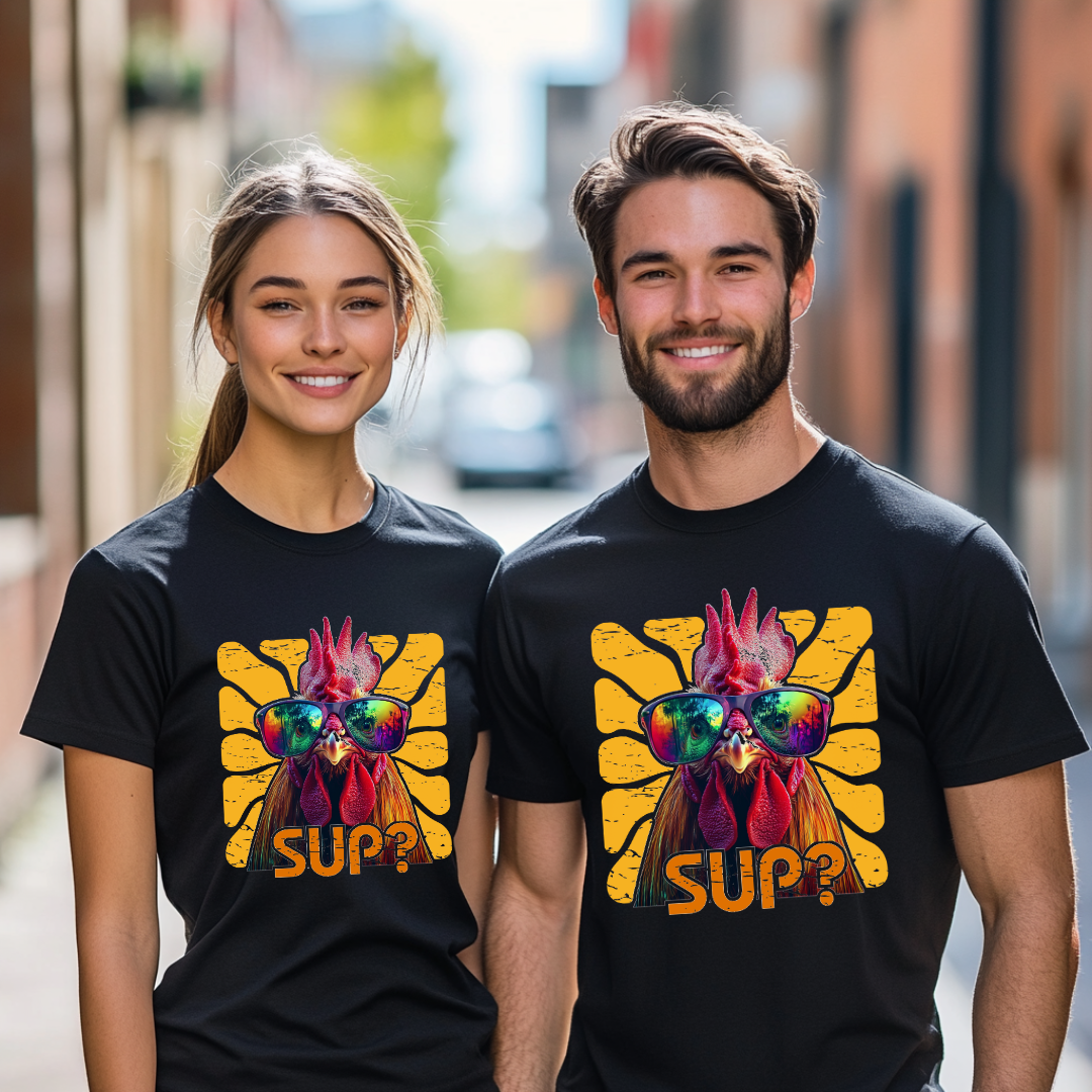 The "Sup" rooster tee is printed on high-quality, comfortable fabric that holds up to long days in the field, chicken coop, or simply lounging at home. The relaxed fit and soft cotton blend make it a go-to piece for anyone who loves to keep things lighthearted and comfy. It’s also available in a variety of sizes, so whether you’re buying it for yourself or someone else, you’ll get a fit that feels just right.