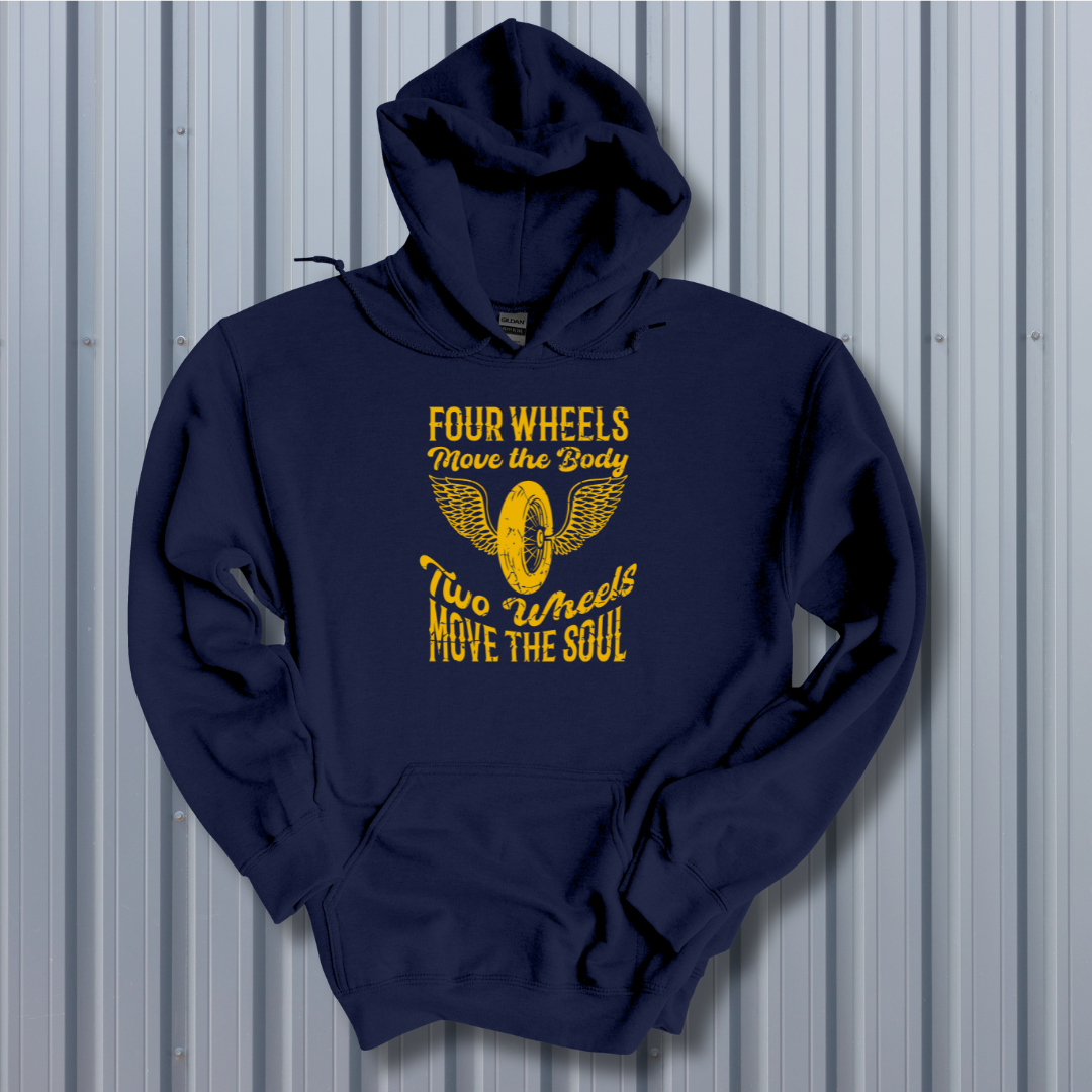 Celebrate the throttle-twisting, wind-chasing lifestyle of the motorcycle community. Give the gift of freedom, fun, and road-born expression with the “Four Wheels Move the Body, Two Wheels Move the Soul” hoodie—only at Oak Grove Expressions, where every design is made to reflect the passions that move us.
